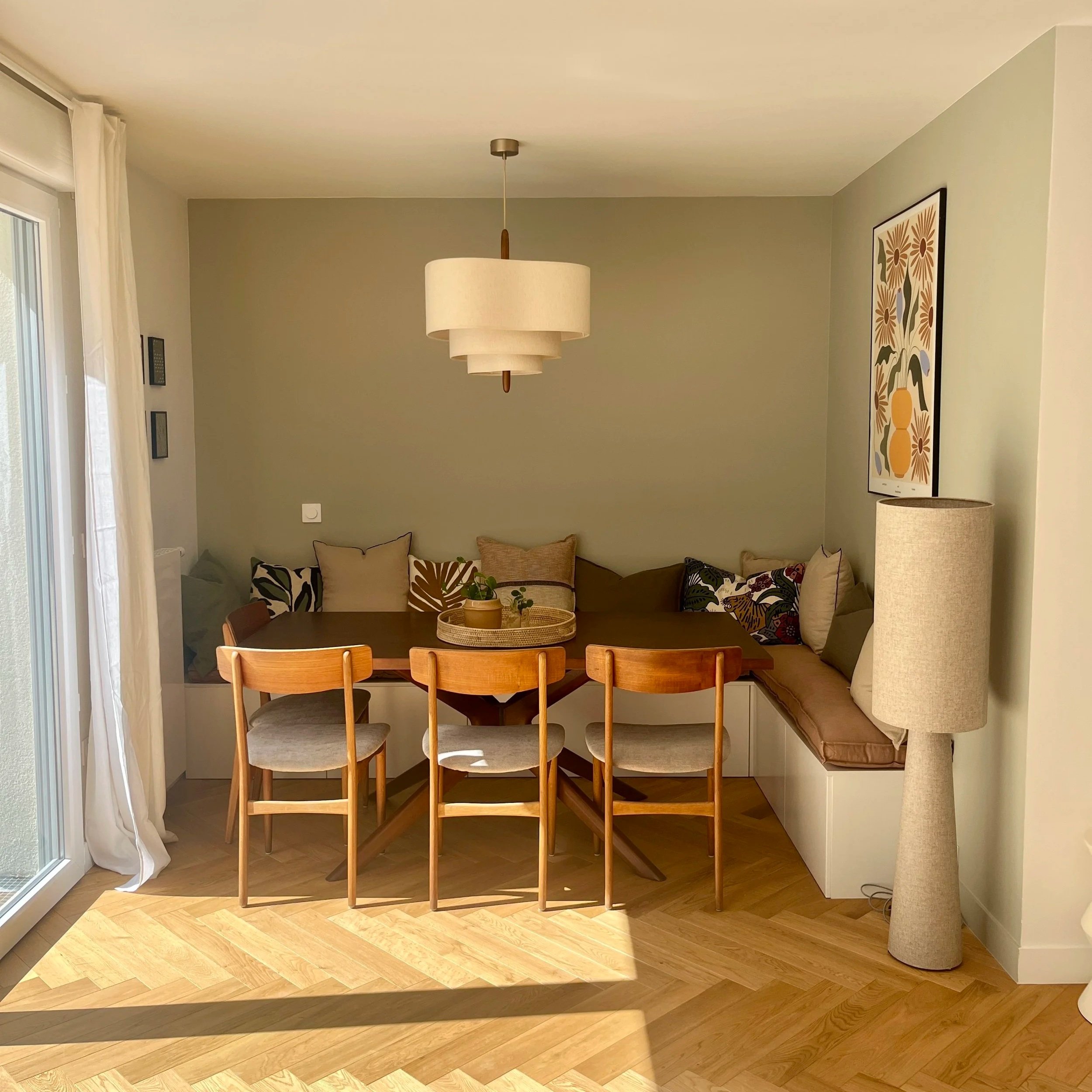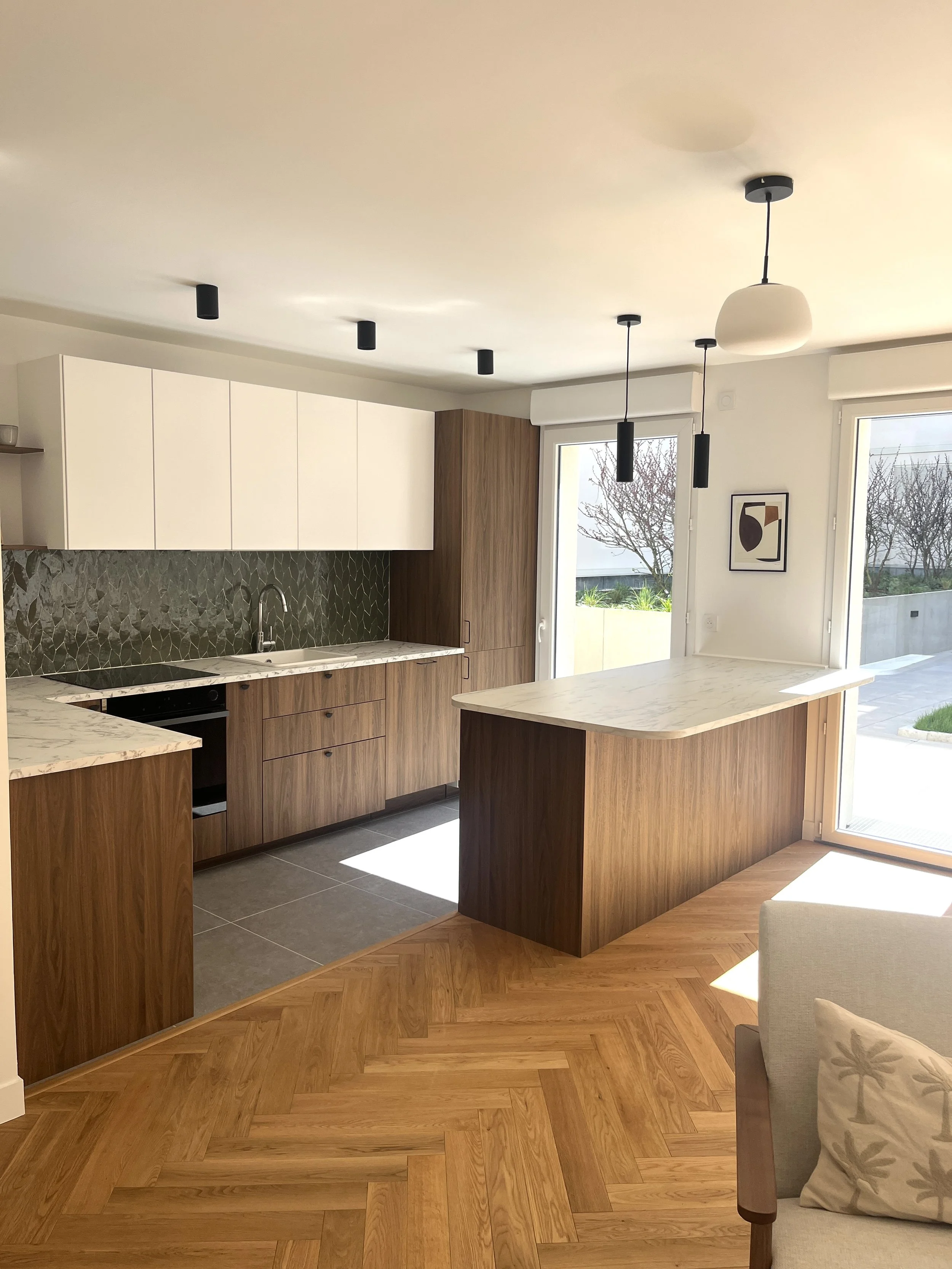 Côté décoration et matériaux, l’ancien parquet du RDC trop sombre a été changé pour un parquet en chêne à bâtons rompus qui transforme ainsi la pièce de vie. Dans l’entrée, un papier peint Terracotta à motifs donne le ton, et côté cuisine, le format feuille du Zellige au coloris vert profond apporte beaucoup de caractère à la pièce de vie.