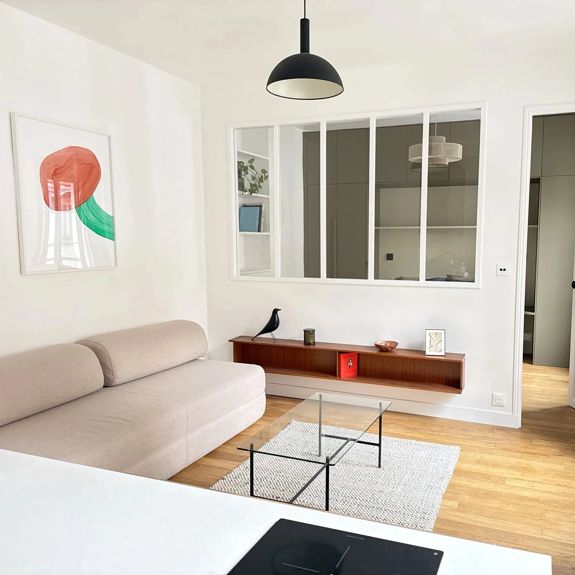 L’enjeu consistait à repenser entièrement le plan afin de créer une chambre avec verrière, permettant ainsi d’agrandir la pièce de vie tout en privilégiant la lumière. La cuisine et la salle d’eau devaient également être transformées pour améliorer la distribution des espaces et la circulation.